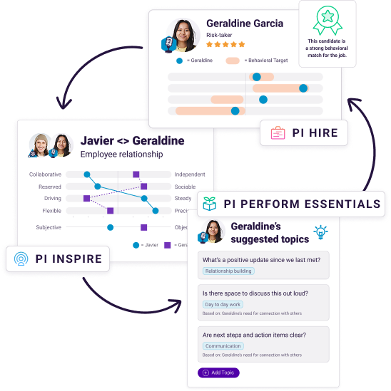 Bundle Hire, Inspire and Perform Essentials together to weave PI insights into 1:1s, team meetings, and tools that your people use every day to significantly improve communication, leadership and performance.