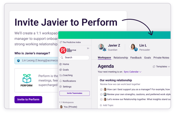 Perform Essentials brings the powerful behavioral insights from Hire and Inspire and puts it directly into the hands of your managers. While those systems provide valuable data, Perform Essentials makes it actionable—helping managers personalize their leadership approach, improve 1:1s, conduct more effective team meetings, and deliver continuous feedback.